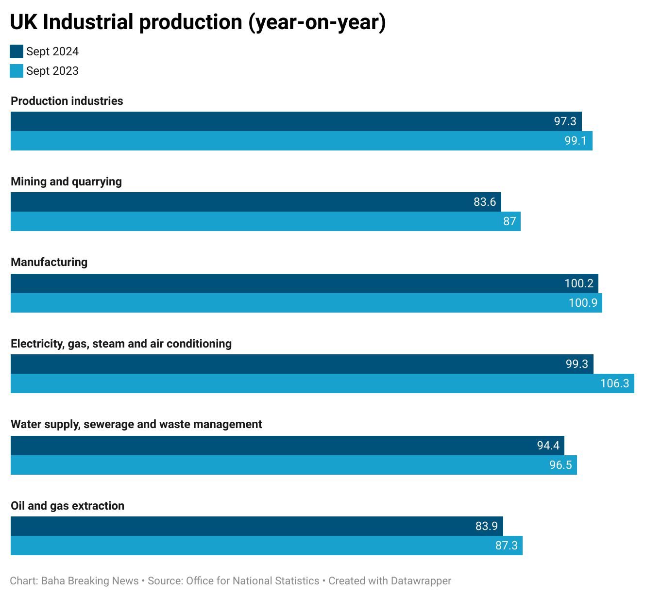 In the three months to September, total production output dropped by 0.2% compared to the previous three-month period.