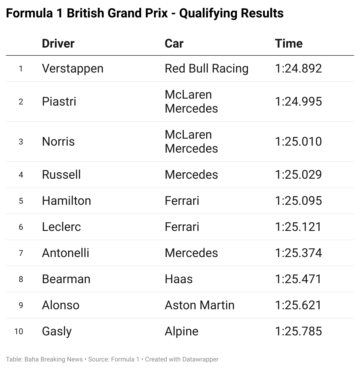 The Red Bull Racing's Max Verstappen will start the Formula 1 British Grand Prix from the pole position after winning the qualifying session on Saturday.